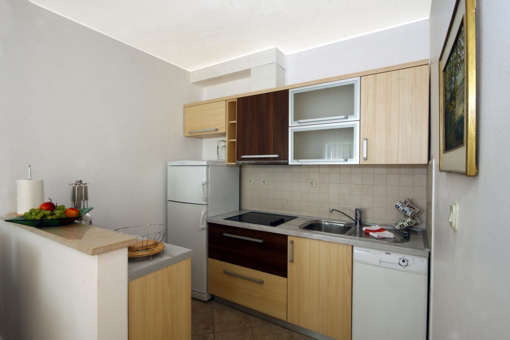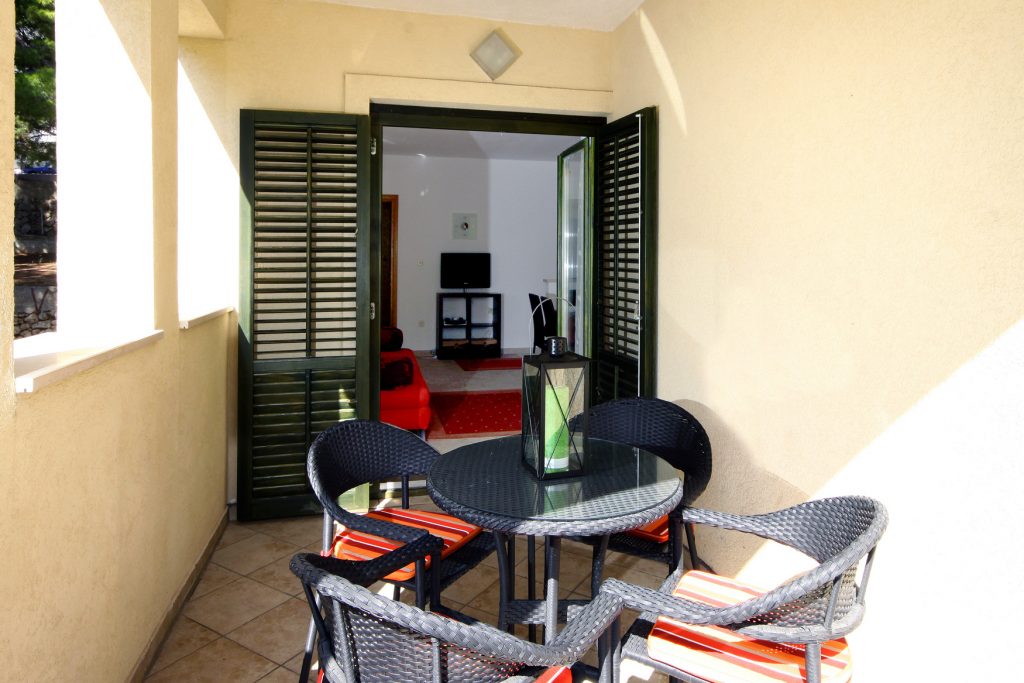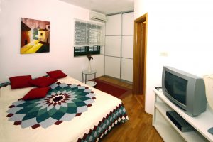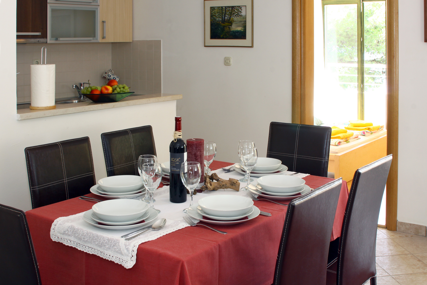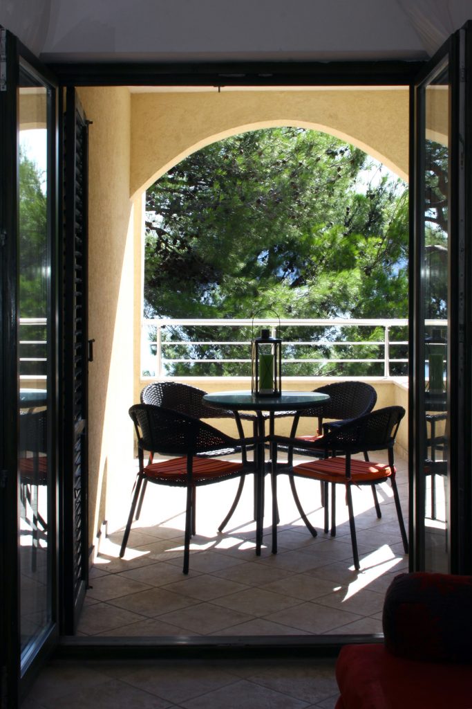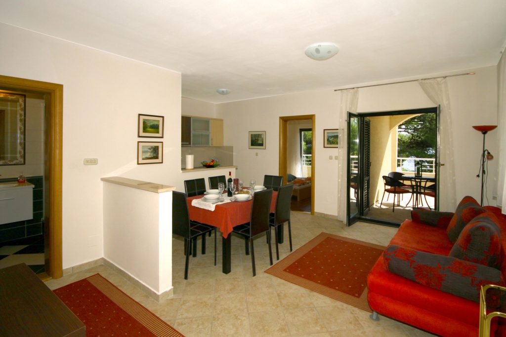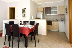 Apartment Tamaris covers the 1st floor, with 4-6 people capacity. The apartment is 80 m2 in size and has a covered terrace. It is air conditioned and modernly decorated and equipped with satellite TV. Apartment Tamaris has two bedrooms with double beds, two bathrooms and a kitchen with a dining area and a living room. The living room has a sofa bed for two people. The kitchen is equipped with a refrigerator with a freezer, a microwave and a dishwasher. In front of the apartment there is a terrace with barbecue and garden furniture.
